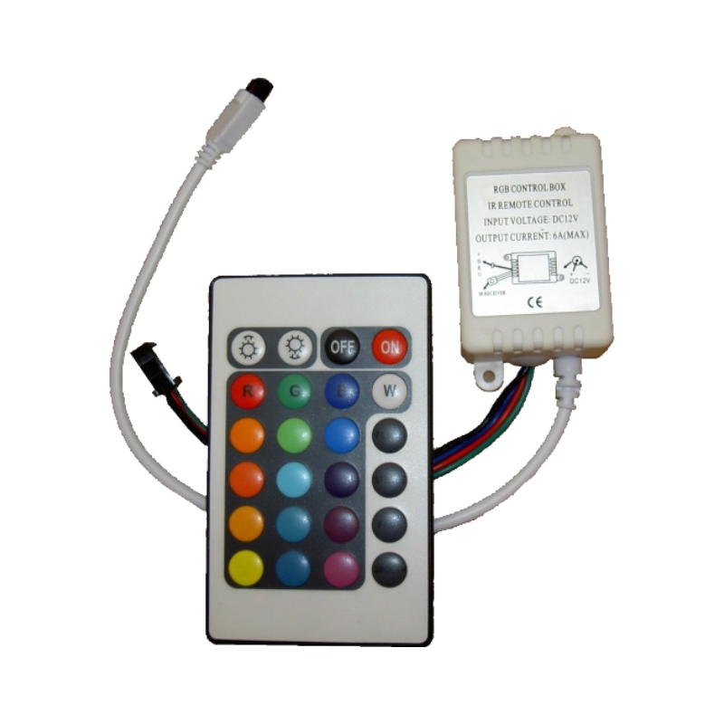12V=72W, 24V=144WW RGB controller KM-RGB-01, 3x2A 12V/72W 24V/144W s IR prenosom, slúži na ovládanie RGB pásov s možnosťou nastavenia rôznych statických farieb svetla alebo spustenia viacerých dynamických programov. Pri nastavení statickej farby je možné zvýšiť / znížiť intenzitu osvetlenia, pri spustenom programe je možné zvýšiť / znížiť rýchlosť programu.