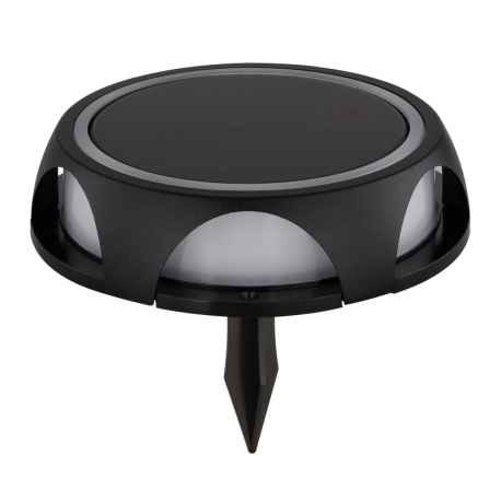 1,2W/LED, 60lm, 3000K Solárne svietidlo, hliník čierny matný, plast čierny/biely, spínač, batéria CR18650 1200mAh 3,7V, IP65, možnosť zapichnutia alebo zavesenia, 3 úrovne jasu: 15% 10lm, 75% 40lm, 100% 60lm, o:140mm, H:36mm, výška s hrotom:11,3cm, LED 1,2W 3V 3000K